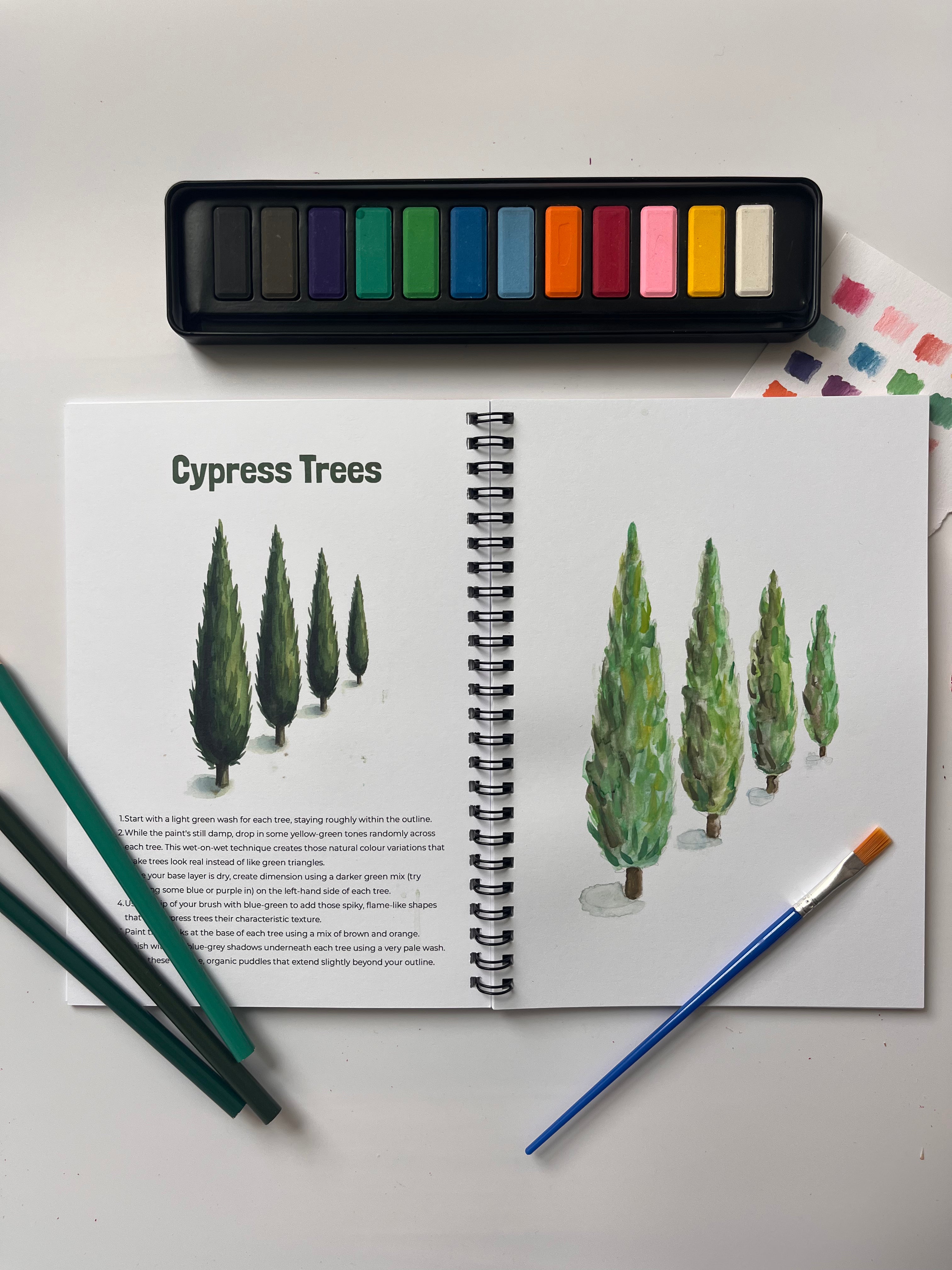 This kit gives you everything needed to create 12 beautiful Italian-inspired watercolour paintings, from Sicilian olives to vintage Fiats.
